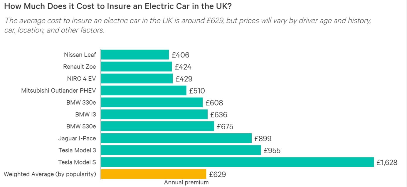 Insurance costs vary widely depending on the make and model of the vehicle. The graph below shows the variation in the annual insurance costs for a selection of electric cars to give you a feel for how much the make and model can affect your insurance premium.